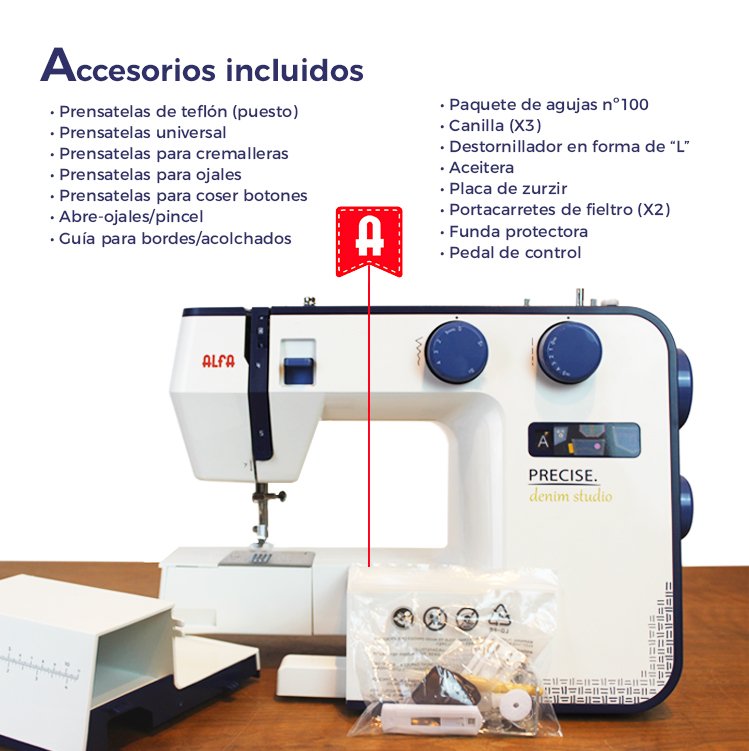 • Amplio set de accesorios incluidos: prensatelas especiales, guías, canillas y funda protectora.