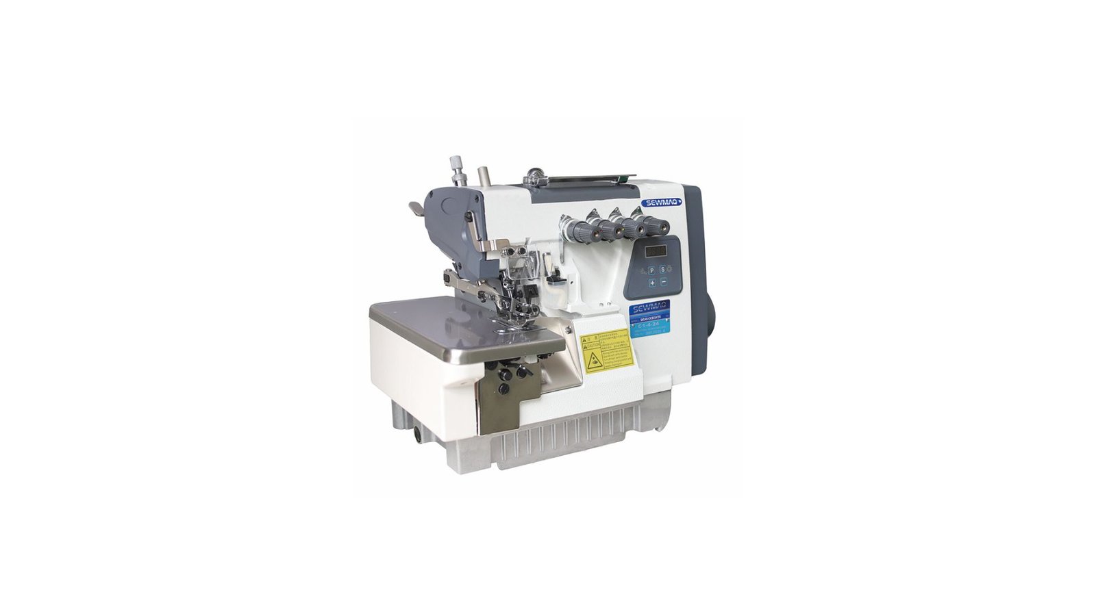 Máquina overlock de 2 agujas 5 hilos (3×4) alta velocidad 6.000 PPM. Equipada con motor servo, caja de control y panel incorporados en el cabezal. Incluye luz de LEDs.